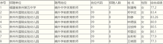 根據(jù)《2021年泉州市直有關(guān)學(xué)校招聘編外合同教師公告》《2021年泉州市直有關(guān)學(xué)校補(bǔ)充招聘編外合同教師公告》等精神,現(xiàn)將擬聘用人員及成績(jī)公示如下,公示時(shí)間:2021年9月17日--2021年9月27日。若有疑問,請(qǐng)咨詢0595-22781630。