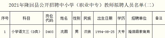 根據(jù)《2021年隆回縣公開招聘中小學(xué)(職業(yè)中專)教師公告》程序與要求,現(xiàn)將2021年隆回縣公開招聘中小學(xué)(職業(yè)中專)教師擬聘人員沈固予以公示。對公示對象如發(fā)現(xiàn)有影響招聘錄用的情況或問題,可在公示期內(nèi)向隆回縣教育局反映。反映問題要實事求是,電話和信函應(yīng)告知真實姓名。對線索不清的匿名電話和匿名信函,公示期間不予受理。