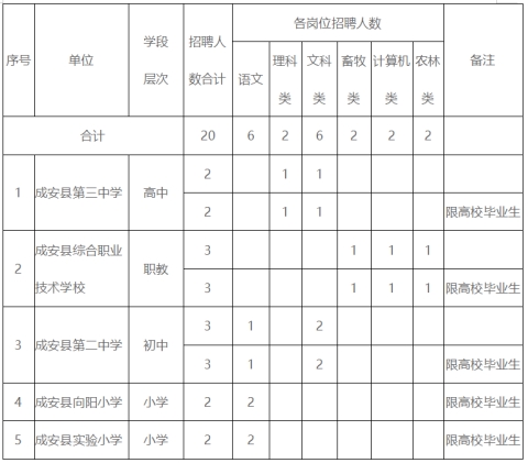 本次選聘職教、高中、初中、小學(xué)教師共20名,部分崗位限高校畢業(yè)生報(bào)考,具體學(xué)科崗位為: