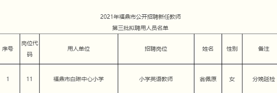 根據《福鼎市教育局福鼎市人力資源和社會保障局關于2021年福鼎市中小學幼兒園新任教師公開招聘工作的通知》(鼎教綜〔2021〕6號)等文件規(guī)定,按照“公開、平等、競爭、擇優(yōu)”原則,經筆試、面試、體檢等環(huán)節(jié),擬聘用人員已進入調檔、考核、聘用審批階段,現將第三批擬聘用人員予以公示,公示時間從2021年11月12日至11月18日,公示期為五個工作日。在此期間,任何單位和個人均可通過來信、來電、來訪等形式,向市教育局黨組反映公示對象存在的問題。以單位名義反映問題的應加蓋公章。以個人名義反映問題的提倡署報本人真實姓名。反映問題要堅持實事求是的原則,反對借機誹謗誣告。