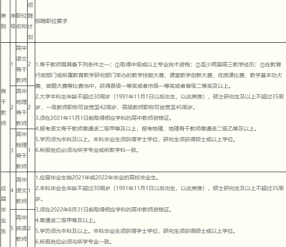 為滿足我校教師隊伍建設(shè)和教育教學(xué)工作需要,落實《轉(zhuǎn)發(fā)〈中央編辦、教育部、財政部、人力資源社會保障部關(guān)于進一步挖潛創(chuàng)新加強中小學(xué)教職工管理的指導(dǎo)意見〉的通知》(湘編辦發(fā)〔2020〕1號)精神,根據(jù)《關(guān)于印發(fā)<湖南省事業(yè)單位公開招聘人員辦法>的通知》(湘人社發(fā)〔2019〕1號)、《關(guān)于進一步規(guī)范我省事業(yè)單位公開招聘考試工作的通知》(湘人社函〔2021〕37號)等有關(guān)規(guī)定,經(jīng)研究,決定面向社會公開招聘高中教師,F(xiàn)將有關(guān)事項公告如下: