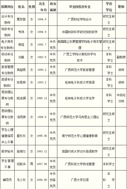 根據(jù)《關(guān)于印發(fā)<廣西壯族自治區(qū)事業(yè)單位公開(kāi)招聘人員實(shí)施辦法>的通知》(桂人社發(fā)[2011]155號(hào))及《廣西金融職業(yè)技術(shù)學(xué)院2021年第一批公開(kāi)招聘非實(shí)名人員控制數(shù)工作人員公告》的有關(guān)規(guī)定,通過(guò)報(bào)名、資格審查、考試、考核、體檢等程序,經(jīng)研究決定,擬聘粟夢(mèng)薇等12位同志為我院工作人員。現(xiàn)將擬聘用人員名單予以公示,公示時(shí)間為2021年12月2日-2021年12月10日,如有異議,請(qǐng)于12月10日下午5:00前以書(shū)面形式并署真實(shí)姓名反饋到學(xué)院紀(jì)委或組織人事處。聯(lián)系地址:廣西南寧市大學(xué)西路168號(hào),郵政編碼:530007,聯(lián)系電話(huà):0771—3481676,0771—3481779。