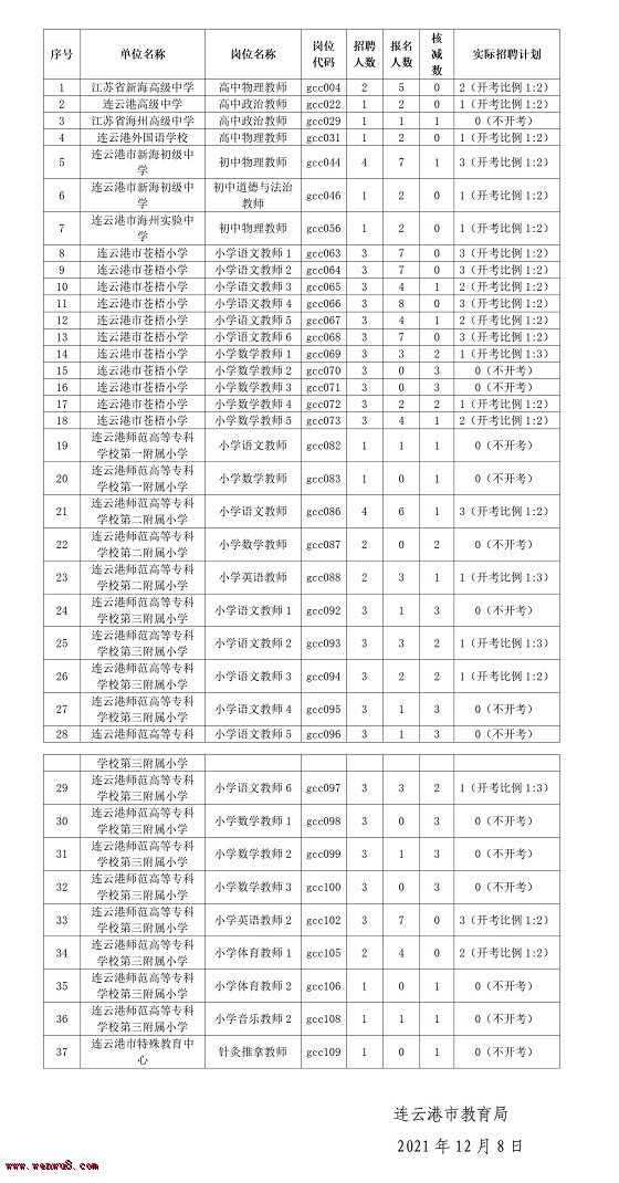 連云港市教育局直屬學(xué)校2021年秋季公開招聘編制內(nèi)高層次人才報名已經(jīng)結(jié)束。按照《連云港市教育局直屬學(xué)校2021年秋季公開招聘編制內(nèi)高層次人才公告》(連人社事招公告核﹝2021﹞76號)要求,招聘人數(shù)與報名人數(shù)的比例達(dá)不到1:3,核減招聘崗位數(shù),直至不予開考;部分崗位因?qū)I(yè)緊缺,經(jīng)招聘單位申請,報連云港市公開招聘綜合管理部門審核降低開考比例,現(xiàn)將有關(guān)崗位說明如下: