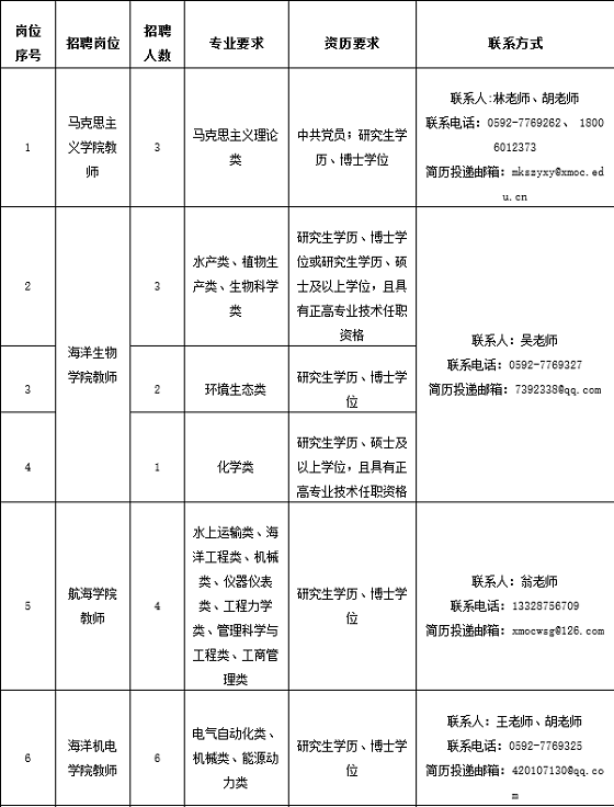 2.報(bào)名方式:應(yīng)聘人員下載《廈門海洋職業(yè)技術(shù)學(xué)院高層次人才應(yīng)聘報(bào)名表》(附件2),根據(jù)崗位要求填寫(xiě)好個(gè)人資料,并將《廈門海洋職業(yè)技術(shù)學(xué)院應(yīng)聘人員報(bào)名表》、個(gè)人簡(jiǎn)歷、研究成果等應(yīng)聘材料發(fā)送到崗位對(duì)應(yīng)郵箱,郵件標(biāo)題注明:應(yīng)聘崗位+姓名+專業(yè)+學(xué)歷+職稱。應(yīng)聘人員對(duì)提交應(yīng)聘材料的真實(shí)性負(fù)責(zé)。