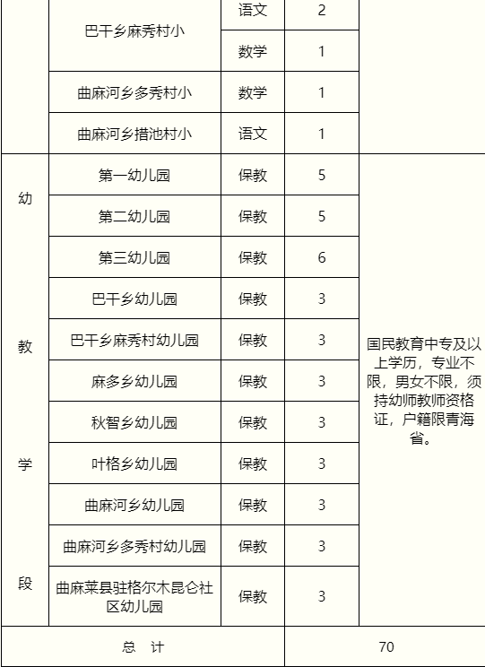 6.年齡在35歲以下(1986年1月1日以后出生),在曲麻萊縣各中小學(xué)(幼兒園)代課6年以上的年齡可放寬至40周歲以下(1982年1月1日以后出生);