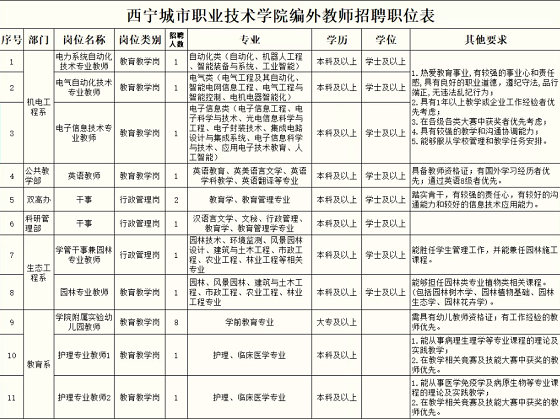 面向社會公開招聘編外教師19名,具體要求詳見《西寧城市職業(yè)技術(shù)學院編外教師招聘職位表》(附件)。
