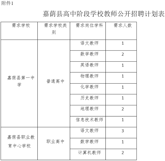 附:1.《嘉蔭縣高中階段學(xué)校教師公開招聘計劃表》
