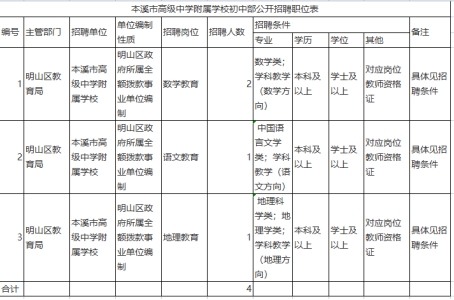 為確保教師隊伍的穩(wěn)定,凡經(jīng)此次招聘進(jìn)入本溪市高級中學(xué)附屬學(xué)校初中部的人員在新聘用崗位最低工作年限6年(含試用期),6年期滿后方可流動。