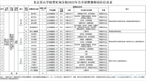 為滿足學(xué)校教育教學(xué)需要,引進(jìn)優(yōu)質(zhì)師資,提高教育教學(xué)質(zhì)量,按照雙方簽訂的《合作辦學(xué)合同書》及北京景山學(xué)校和辦學(xué)初期提出的建設(shè)現(xiàn)代化國(guó)際化學(xué)校的標(biāo)準(zhǔn),擬在今年下學(xué)期開學(xué)前,通過在北京師范大學(xué)、東北師范大學(xué)、陜西師范大學(xué)、華東師范大學(xué)、河北師范大學(xué)、華中師范大學(xué)等師范院校進(jìn)行宣傳,面向高等院校公開招聘40名全日制普通類一本以上院;騾^(qū)域知名師范類院校高校畢業(yè)生,具體崗位條件詳見《北京景山學(xué)校曹妃甸分校2021年公開招聘教師崗位信息表》。