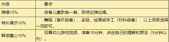 2.課堂教學考核(30%):現(xiàn)場模擬教學,時間為8分鐘,自定內(nèi)容和年段,考核現(xiàn)場不提供幼兒。