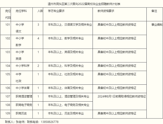招聘事業(yè)編制教師15名,具體招聘崗位、要求詳見《溫州市洞頭區(qū)第二次面向2022屆高校畢業(yè)生招聘教師計劃表》(附表1)。