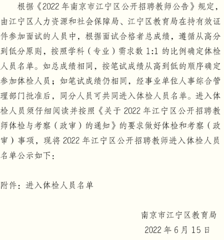 2022年江蘇南京江寧區(qū)公開招聘教師進入體檢人員名單公示