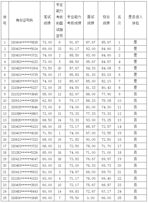 各項(xiàng)成績(jī)均采用百分制計(jì)算,保留兩位小數(shù)(第三位小數(shù)按四舍五入辦法處理)。按照筆試成績(jī)(符合加分條件報(bào)考人員為筆試和加分項(xiàng)目之和)占30%、專業(yè)能力考核成績(jī)占60%、面試成績(jī)占10%的比例計(jì)算綜合成績(jī)。根據(jù)綜合成績(jī),按照招聘崗位計(jì)劃1:1的比例由高分到低分確定參加體檢人員(如綜合成績(jī)相同,按專業(yè)能力考核總成績(jī)從高分到低分確定體檢人員)。