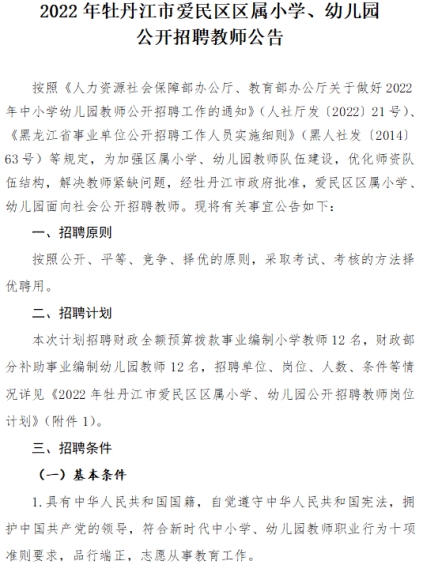 2022年黑龍江牡丹江市愛(ài)民區(qū)區(qū)屬小學(xué)、幼兒園公開(kāi)招聘教師公告【24人】