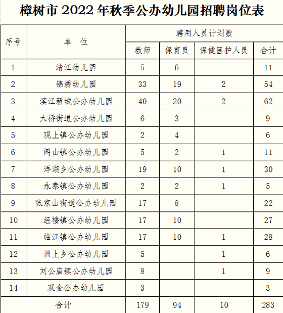 2022年秋季樟樹市公辦幼兒園招聘教師179人、保育員94人、保健醫(yī)護人員10人,共283人。具體學校及崗位表見《樟樹市2022年秋季公辦幼兒園招聘崗位表》(附件1)。
