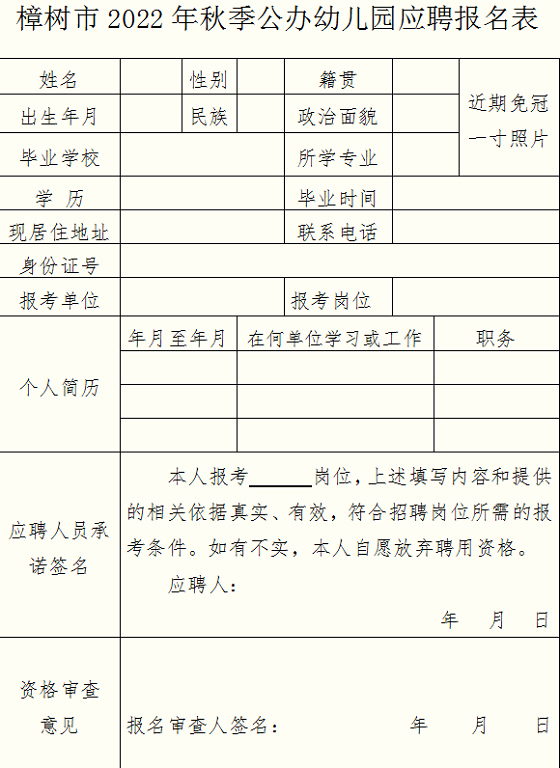 (1)每人限報一個崗位,應(yīng)聘人員填報《樟樹市2022年秋季公辦幼兒園應(yīng)聘報名表》(附件2);