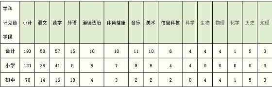根據(jù)城鄉(xiāng)學校人事編制和學科結(jié)構(gòu)調(diào)查摸底情況,結(jié)合城區(qū)學校崗位需求,確定此次計劃遴選交流190人(每個學科崗位計劃與報名人數(shù)比例不足1:1.5的,核減相應學科崗位計劃數(shù))。具體學段學科如下: