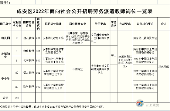 本次面向社會公開招聘勞務(wù)派遣教師185名,具體崗位招聘計劃詳見附件《咸安區(qū)2022年面向社會公開招聘勞務(wù)派遣教師崗位一覽表》。