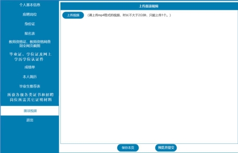 ⑨面談以“我競(jìng)聘本崗位優(yōu)勢(shì)”為題,錄制2分鐘視頻(嚴(yán)禁透露個(gè)人信息,始終保持本人正面上半身入鏡,視頻格式為mp4,大小不超過100MB,視頻只能上傳1個(gè),提交前可在線預(yù)覽,如感覺效果不好,可重新錄制再次上傳;報(bào)名成功后則無法再次替換原視頻)。報(bào)名平臺(tái)界面如下: