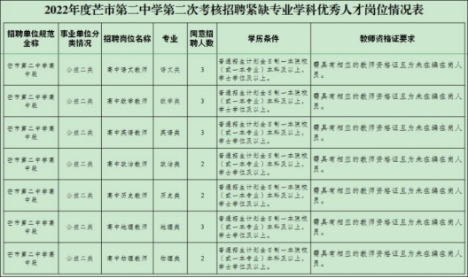 (二)2020年、2021年、2022年畢業(yè)的普通招生計劃全日制一本院校(或一本專業(yè))本科及以上,并有相應(yīng)學(xué)士學(xué)位及以上學(xué)位畢業(yè)生,具體條件見《2022年度芒市第二中學(xué)第二次考核招聘緊缺專業(yè)學(xué)科優(yōu)秀人才崗位情況表》。