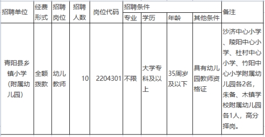 2022年青陽縣鄉(xiāng)鎮(zhèn)小學(xué)(附屬幼兒園)公開招聘教師10名。具體招聘崗位和招聘條件見下表。