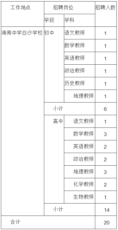 根據(jù)《海南省事業(yè)單位公開招聘人員實(shí)施辦法》(瓊?cè)松绨l(fā)〔2018〕516號(hào))等相關(guān)規(guī)定,結(jié)合海南中學(xué)白沙學(xué)校擴(kuò)大辦學(xué)規(guī)模的實(shí)際需要,現(xiàn)招聘20名初、高中教師。