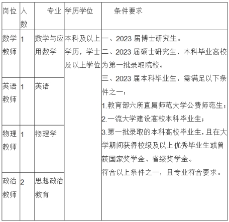 注:1.有關(guān)專(zhuān)業(yè)問(wèn)題由招聘單位及主管部門(mén)負(fù)責(zé)解釋?zhuān)?.師范專(zhuān)業(yè)應(yīng)屆畢業(yè)生入職前須具備相應(yīng)的教師資格證,非師范專(zhuān)業(yè)應(yīng)屆畢業(yè)生要求入職兩年內(nèi)取得相應(yīng)的教師資格證;3.境外留學(xué)人員,畢業(yè)時(shí)間要求為2022年8月至2023年7月,所學(xué)專(zhuān)業(yè)和畢業(yè)時(shí)間等信息以教育部留學(xué)服務(wù)中心出具的認(rèn)證書(shū)為準(zhǔn)。
