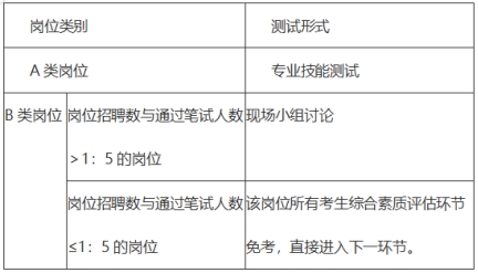 綜合素質(zhì)評(píng)估主要采取專業(yè)技能測(cè)試、小組討論等形式對(duì)考生進(jìn)行考察。各崗位具體考核形式見(jiàn)下表。