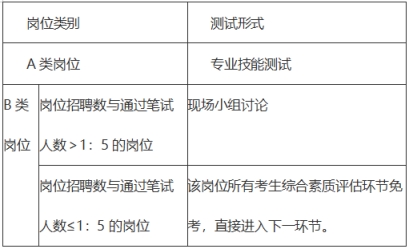 綜合素質(zhì)評(píng)估主要采取專業(yè)技能測(cè)試、小組討論等形式對(duì)考生進(jìn)行考察。各崗位具體考核形式見(jiàn)下表。