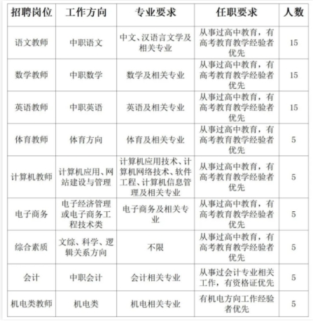 (1)報名專業(yè)教師崗位有企業(yè)工作經(jīng)歷,具備高級技能等級證書者優(yōu)先;報名語數(shù)外專業(yè)教師崗位,有語文、數(shù)學(xué)、英語高中考試輔導(dǎo)經(jīng)歷者優(yōu)先。
