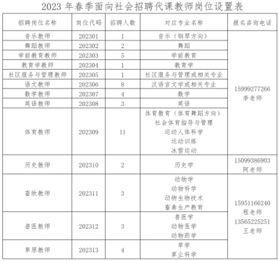 根據(jù)《事業(yè)單位人事管理條例》《關(guān)于印發(fā)自治區(qū)事業(yè)單位面向社會公開招聘工作人員辦法的通知》(新人社發(fā)〔2013〕141號)等有關(guān)規(guī)定,2023年春季伊犁職業(yè)技術(shù)學(xué)院計劃面向社會公開招聘非事業(yè)編制代課教師75名,F(xiàn)將有關(guān)事項公告如下: