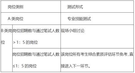 綜合素質(zhì)評(píng)估主要采取專業(yè)技能測(cè)試、小組討論等形式對(duì)考生進(jìn)行考察。各崗位具體考核形式見下表。