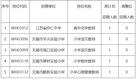 根據(jù)《無(wú)錫市錫山區(qū)教育系統(tǒng)面向2023屆全日制普通高校應(yīng)屆畢業(yè)生公開(kāi)招聘事業(yè)編制教師公告》(錫人社事招公告核(2022)68號(hào))規(guī)定,華中師范大學(xué)考點(diǎn)共5個(gè)招聘崗位的報(bào)名人數(shù)未達(dá)開(kāi)考比例人數(shù),經(jīng)研究并報(bào)無(wú)錫市錫山區(qū)人力資源和社會(huì)保障局核準(zhǔn)后,以下崗位招聘人數(shù)予以核減: