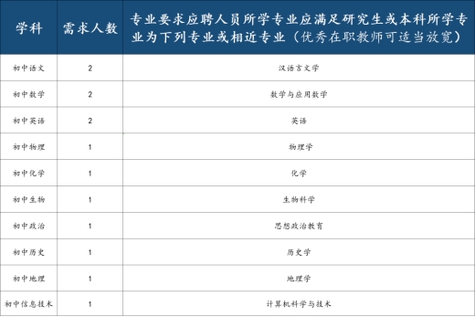 根據(jù)學(xué)校發(fā)展需要,現(xiàn)公開(kāi)招聘初中段教師,將有關(guān)事項(xiàng)公告如下: