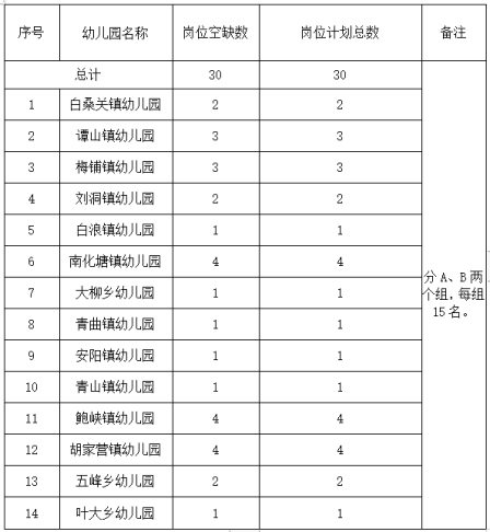 為便于面試組織,本次幼兒園招聘30名,分為A、B組,A組招15名、B組招15名。A、B組的考生互不交叉,分組資格審查,分組面試,分組錄取。最終各組錄取人員確定后,統(tǒng)一選崗。請考生在報(bào)名時(shí)充分考慮A、B組的報(bào)名人數(shù)分布。
