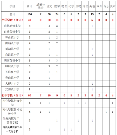 根據《事業(yè)單位人事管理條例》(國務院令第652號)、《事業(yè)單位公開招聘人員暫行規(guī)定》(人事部令第6號)、《省委組織部和省人力資源和社會保障廳關于轉發(fā)<中組部、人社部關于進一步做好艱苦邊遠地區(qū)縣鄉(xiāng)事業(yè)單位公開招聘工作的通知>的通知》(鄂人社函〔2017〕220號)、《關于進一步規(guī)范全省事業(yè)單位公開招聘工作的若干意見》(鄂人社發(fā)〔2016〕23號),《省教育廳省委編辦省人社廳省財政廳省發(fā)改委關于做好2023年全省中小學教師公開招聘工作的通知》(鄂教人函〔2023〕2號),鄖陽區(qū)2023年面向社會公開招聘農村義務教育學校教師,現(xiàn)公告如下: