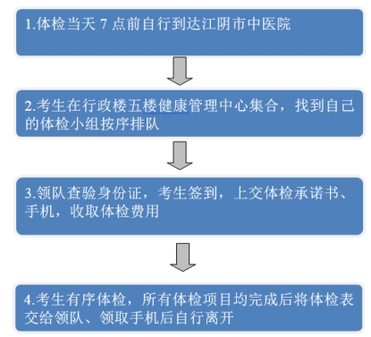 1、請考生帶好身份證原件(其余證件一律無效)、體檢承諾書(見附件2,請預(yù)先下載填寫好)于體檢當天早上7:00前到江陰市中醫(yī)院(人民中路130號,公交6路、8路、9路、10路、15路等到中山站下車向東步行100米左右)行政樓五樓健康管理中心集合。體檢費由考生自理(550元,收取現(xiàn)金,請自備零錢)。逾期未到者,作自動放棄處理。