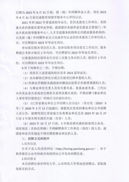 2023年上半年鹽城阜寧縣教育局校園招聘方案【91名】
