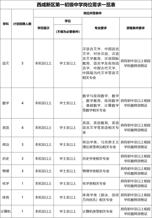 西咸新區(qū)第一初級中學(xué)崗位需求一覽表