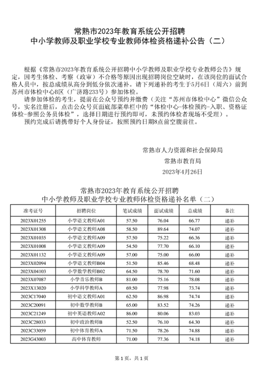 2023年蘇州常熟市教育系統(tǒng)公開招聘中小學(xué)教師及職業(yè)學(xué)校專業(yè)教師體檢資格遞補(bǔ)公告(二)