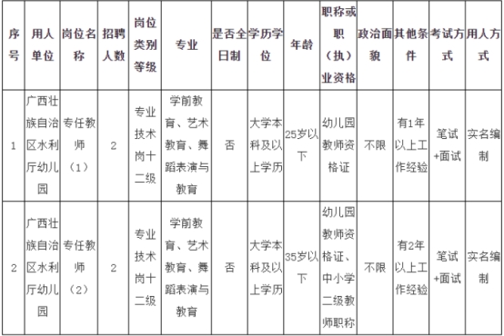 廣西壯族自治區(qū)水利廳幼兒園2023年公開招聘信息表