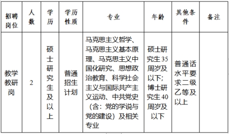 本次招聘崗位為楊善洲干部學院事業(yè)編制內(nèi)教師崗位,招聘人數(shù)2人,專門從事楊善洲干部學院教學和教研工作,參與課程、課件、教材和現(xiàn)場教學點的開發(fā)與研究,承擔培訓班的授課任務(wù)等具體工作,崗位要求如下: