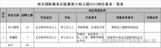 此次招聘采用“先面試、后筆試”的程序。招聘總數(shù)48人,其中幼兒教師45人,保健醫(yī)3人,具體招聘崗位、人數(shù)及其他要求詳見附件《西安國際港務(wù)區(qū)陸港第六幼兒園崗位需求一覽表》。