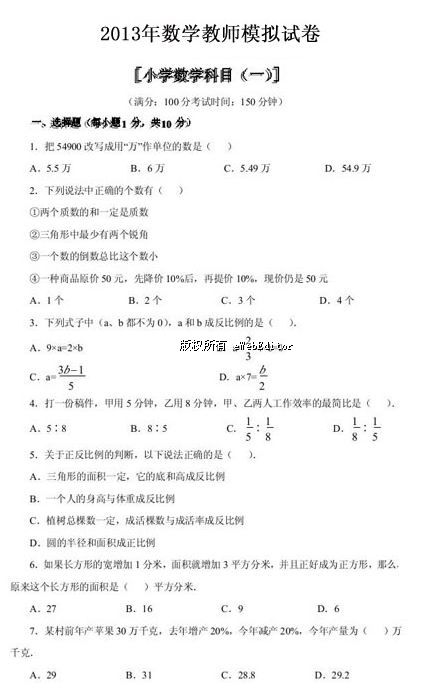 2012年小學(xué)數(shù)學(xué)教師招聘考試專業(yè)知識(shí)模擬試題卷一(附參考答案)