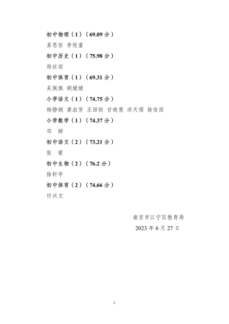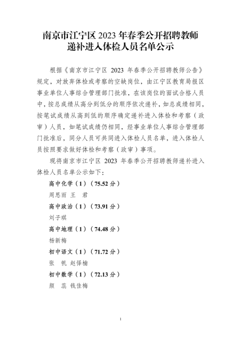 2023年南京市江寧區(qū)春季公開招聘教師遞補(bǔ)進(jìn)入體檢人員名單公示