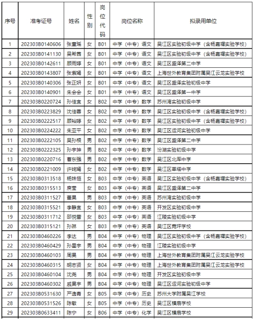 歡迎加入蘇州教師招聘群;571213887,考情、招聘信息早知道!根據(jù)《2023年蘇州市吳江區(qū)公開招聘備案制教師公告》,經(jīng)過考試、體檢、政審等程序,以下擬錄用人員予以公示。