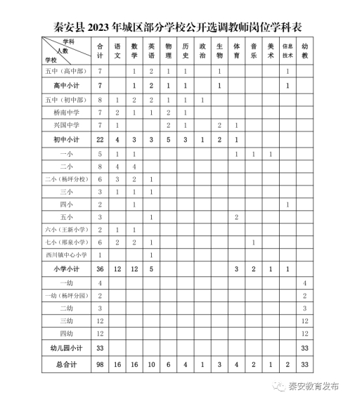 附:秦安縣2023年城區(qū)部分學(xué)校公開選調(diào)教師崗位學(xué)科表