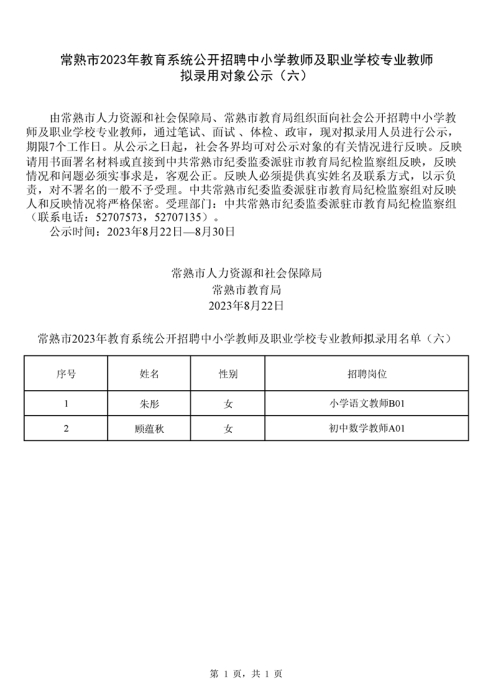 2023年蘇州常熟市教育系統(tǒng)公開(kāi)招聘中小學(xué)教師及職業(yè)學(xué)校專業(yè)教師擬錄用對(duì)象公示(六)