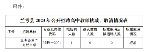 蘭考縣2023年公開招聘高中教師報(bào)名工作已于2023年8月21日結(jié)束。按照《蘭考縣2023年公開招聘高中教師公告》要求,根據(jù)報(bào)名、交費(fèi)情況,對(duì)達(dá)不到開考比例的崗位予以核減、取消。現(xiàn)就核減、取消崗位(見附件)予以公示。