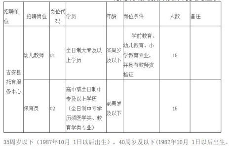 本次公開招聘計劃共30名,招聘崗位、招聘人數(shù)及資格條件詳見《2023年度吉安縣托育服務(wù)中心招聘非在編聘用制幼兒教師及保育員崗位表》(附件1)。